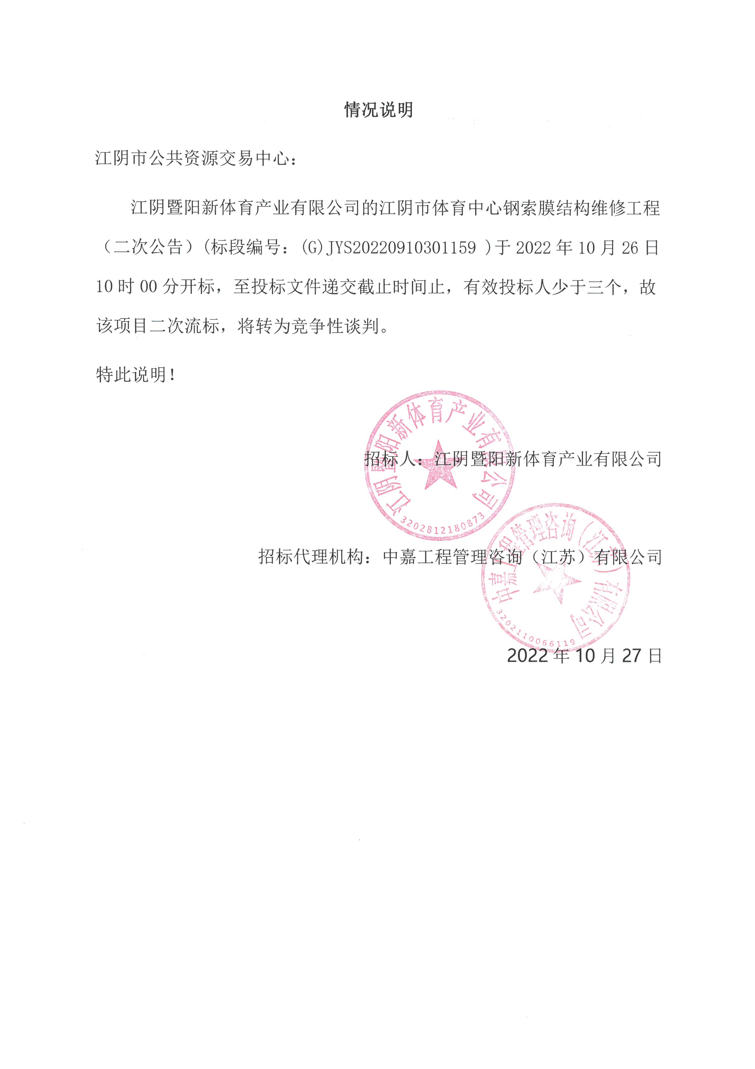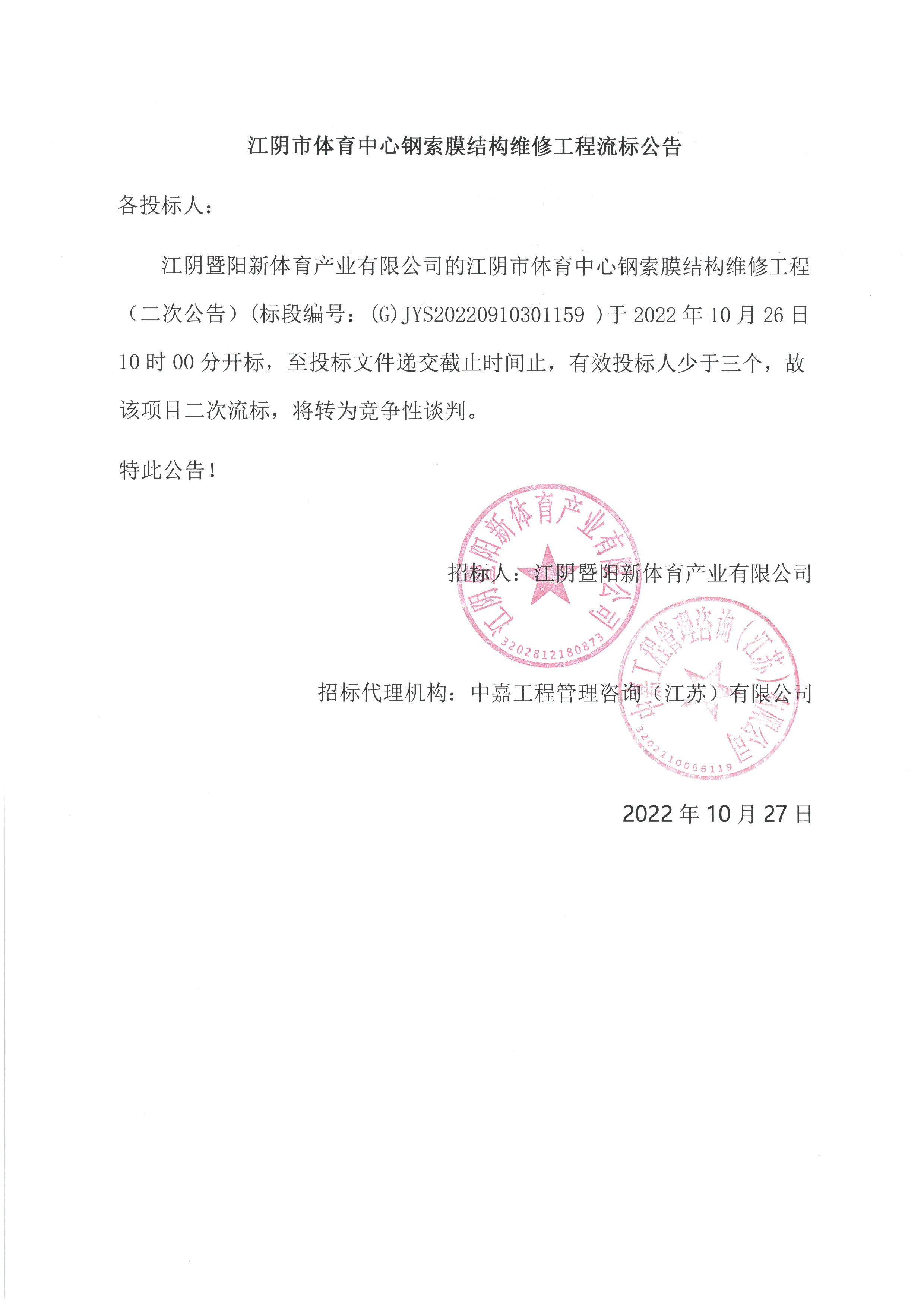 江陰暨陽新體育產(chǎn)業(yè)有限公司的江陰市體育中心鋼索膜結(jié)構(gòu)維修工程(二次公告)(標(biāo)段編號:(G)JYS20220910301159 )于2022年10月26日10時00分開標(biāo),至投標(biāo)文件遞交截止時間止,有效投標(biāo)人少于三個,故該項目二次流標(biāo),將轉(zhuǎn)為競爭性談判。